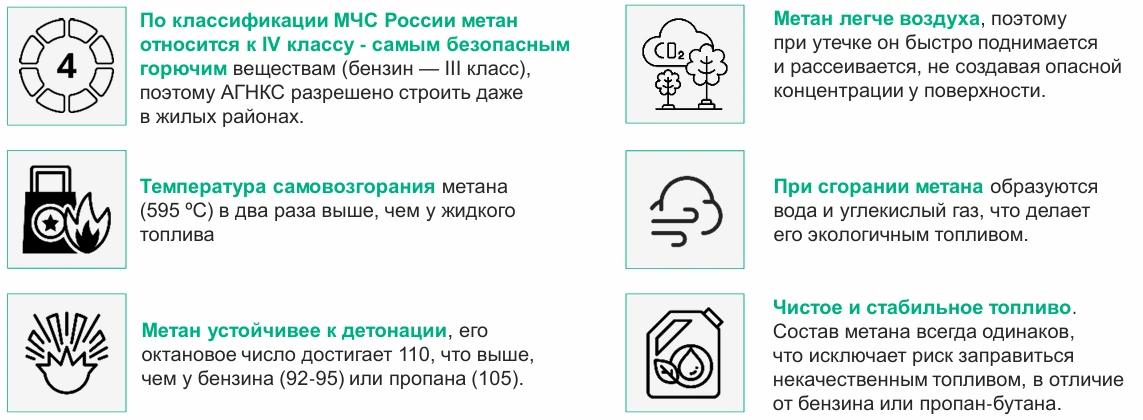 По классификации МЧС России метан относится к IV классу — самым безопасным горючим веществам (бензин — III класс), поэтому АГНКС разрешено строить даже в жилых районах.