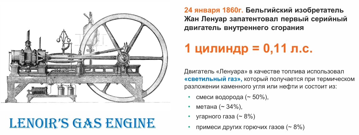 24 января 1860 г. Бельгийский изобретатель Жан Ленуар запатентовал первый серийный двигатель внутреннего сгорания.
