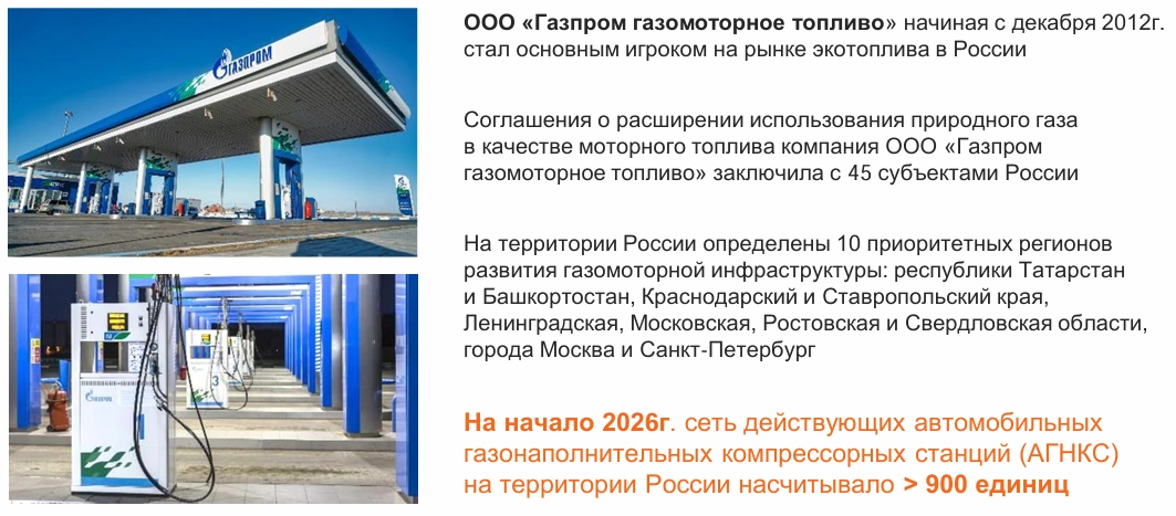 На начало 2026 г. сеть действующих автомобильных газонаполнительных компрессорных станций (АГНКС) на территории России насчитывало > 900 единиц.
