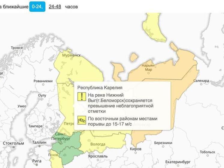 В Карелии снова объявлен «желтый» уровень опасности. Основная причина — усиление ветра и сложная гидрологическая ситуация на одной из рек региона. Согласно прогнозам Гидрометцентра, с 21:00 6 марта до утра 7 марта в восточных районах ожидаются порывы ветра скоростью до 15–17 м/с. Также на реке Нижний Выг у Беломорска сохраняется превышение опасной отметки уровня воды.