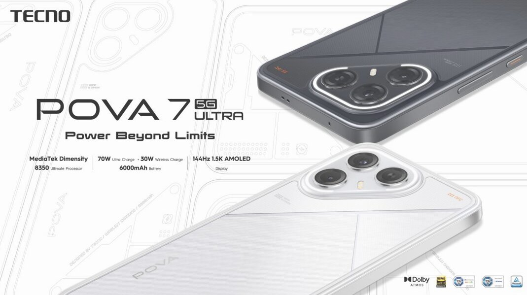 Флагманом линейки стала модель POVA 7 Ultra 5G, которая работает на топовом процессоре Dimensity 8350 Ultimate AI, набирающем в бенчмарке AnTuTu 1,53 миллиона баллов и обеспечивающим стабильные 120 fps в играх. Его дополняет аккумуляторная батарея ёмкостью 6000 мАч с поддержкой проводной зарядки мощностью 70 Вт и беспроводной на 30 Вт. TECNO использует 12-слойную систему охлаждения Hyper Cooling System с испарительной камерой площадью 5300 мм² для поддержания высокой производительности во время длительных игровых сессий. Глубокое погружение в происходящее на экране действие обеспечивает и пара динамиков с поддержкой Dolby Atmos.