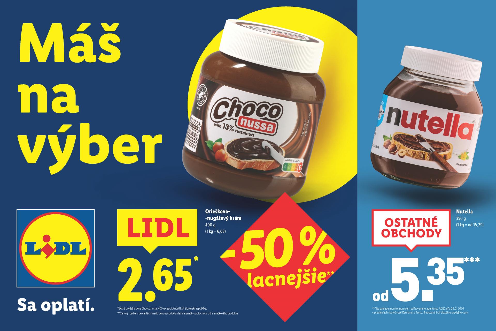 Podobnú úsporu ponúkajú aj ďalšie produkty z portfólia privátnych značiek Lidla. Platí to aj pre orieškovo-nugátový krém značky Choco Nussa, pri ktorom možno ušetriť približne polovicu ceny v porovnaní so známymi značkovými alternatívami. Ide pritom o produkt, ktorý si mnohí radi doprajú pri raňajkách či dezertoch.