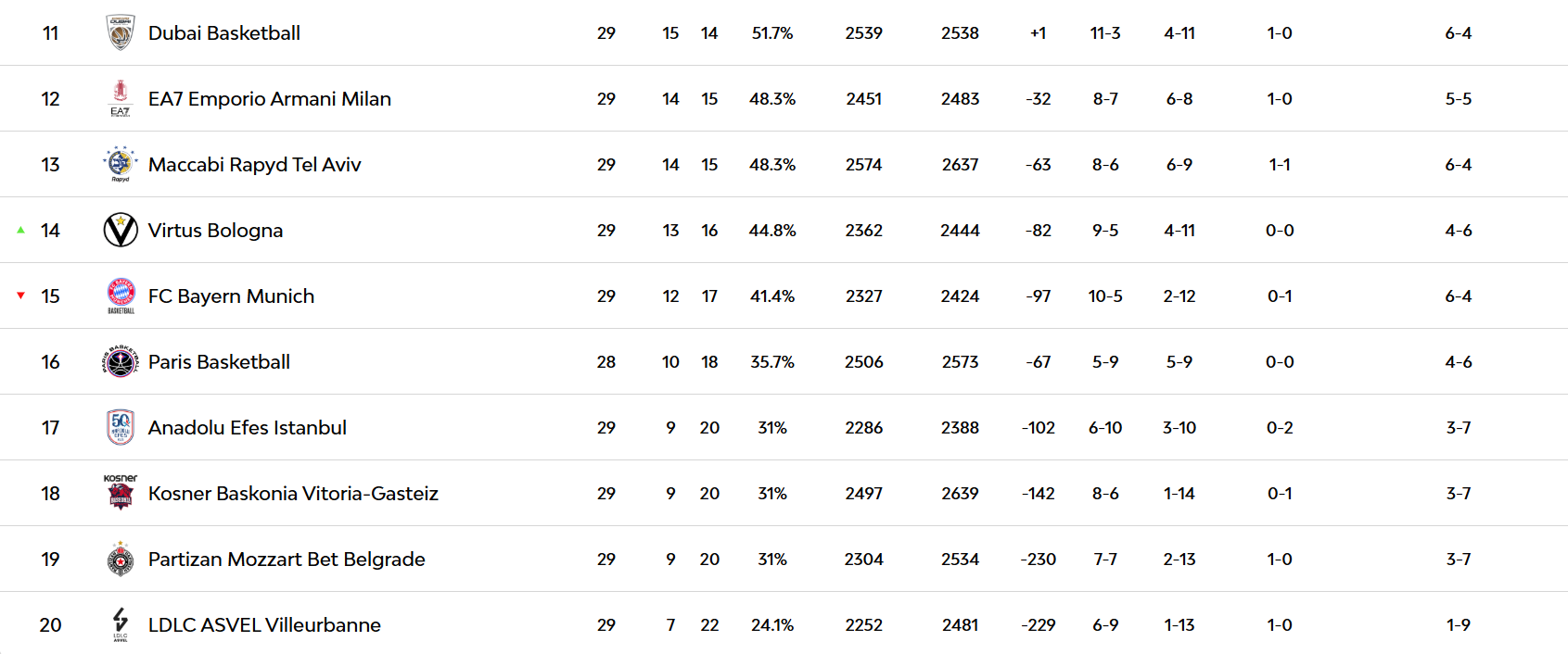 Η ομάδα του Εργκίν Αταμάν έχει πλέον ρεκόρ 16-13 και έχει πέσει στην 10η θέση, μόλις 1,5 νίκη πάνω από τη Ντουμπάι (15-14). Το δύσκολο πρόγραμμα των «πράσινων» δυσχεραίνει την κατάσταση, καθώς οι αντίπαλοι που απομένουν έχουν συνολικό ρεκόρ 59,06%, ενώ ο Παναθηναϊκός έχει ρεκόρ 55,17%.