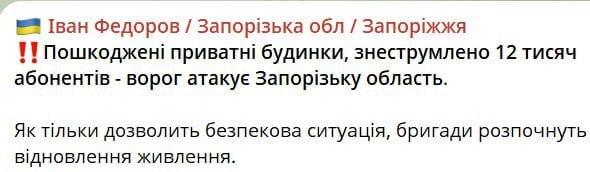 ▪️Глава запорожской ОВА заявил, что в результате налета российских ударных БПЛА без света остались ещё 12 тысяч абонентов.