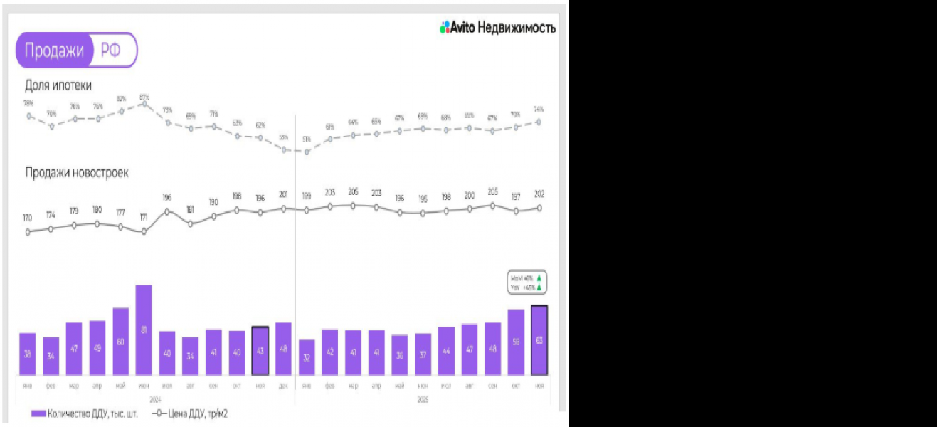 Объем строительства по сравнению с ноябрем 2024-го вырос на 1% до 120,8 млн кв. м. При этом старт новых проектов и ввод объектов в эксплуатацию сократился на 15% и 5% соответственно.
