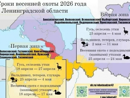 В южную зону входят Гатчинский, Волосовский, Кингисеппский, Ломоносовский, Лужский, Сланцевский, Тосненский, Киришский районы. Установленные сроки охоты там: - на гуся и селезня утки — с 18 по 27 апреля; - на вальдшнепа, тетерева и глухаря — с 25 апреля по 4 мая; - охота с подсадными (манными) утками — с 18 апреля по...
