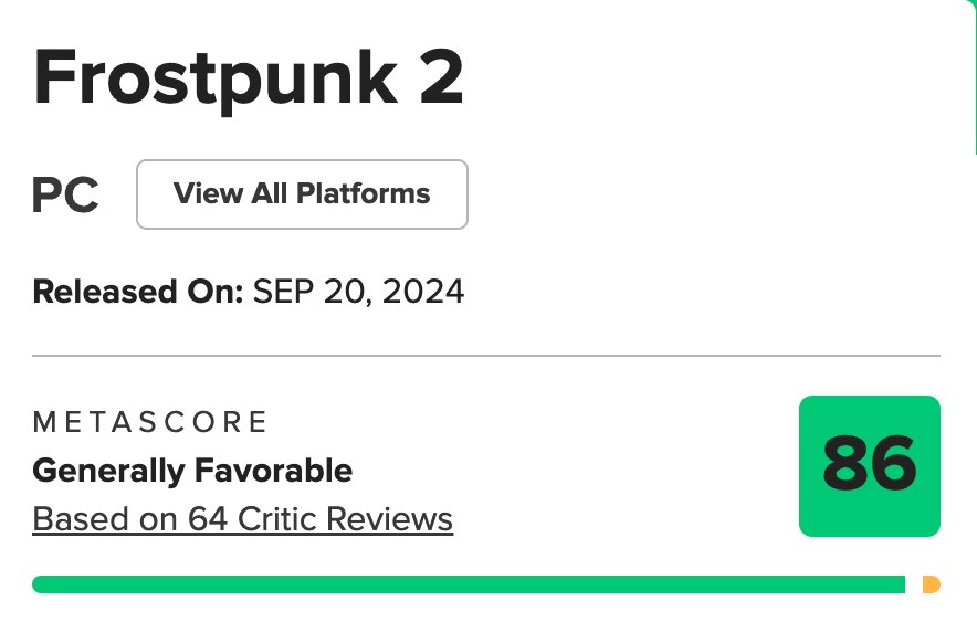 Вчера, 20 сентября, состоялся официальный релиз градостроительного симулятора с элементами выживания Frostpunk 2, который очень понравился журналистам со всего мира. На текущий момент у проекта 86 баллов из 100 возможных на Metacritic, так что сиквел оценили даже лучше оригинала (у первой части было 84 балла). Представители профильных СМИ хвалят новый проект за внушительную реиграбельность, улучшения игровых механик из первой части, привлекательную графическую составляющую и более глубокую проработку взаимоотношений с различными слоями населения в поселениях. Собственно, то, что разработчики обещали аудитории, они и предоставили.