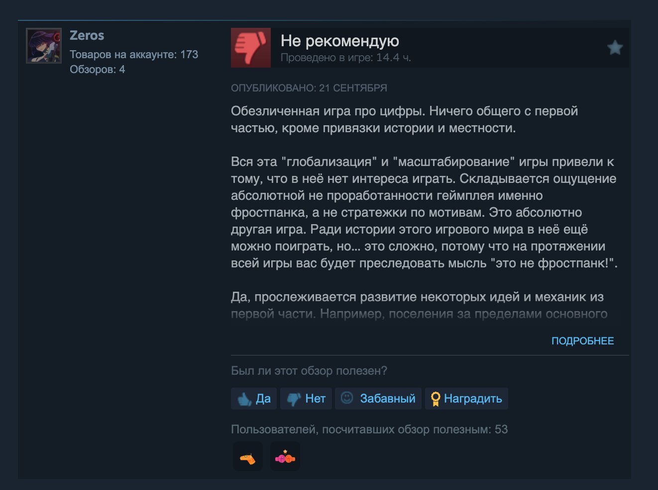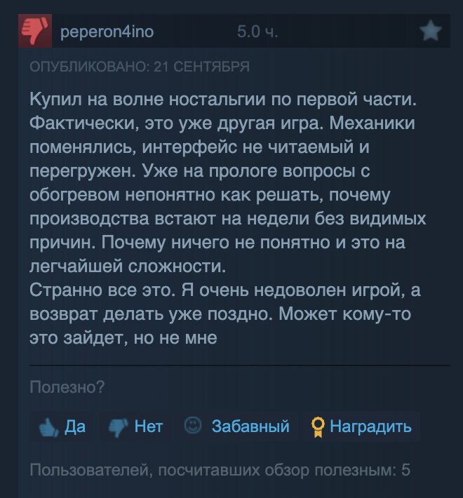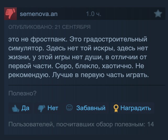 Так что хотя журналисты в один голос твердят, что это лучший градостроительный симулятор в этом году, на деле ситуация спорная — преданные фанаты говорят, что это не Frostpunk вовсе, а просто новая игра в старом сеттинге, кто-то активно критикует длинное и скучное обучение, а кому-то не понравилось кардинальное изменение игровых механик. С другой стороны, даже с учётом этого негатива в Steam у проекта 79% положительных обзоров (правда, стоит отметить, что многие обзоры с отметкой «Положительно» на самом деле крайне негативные — складывается ощущение, что геймеры просто перепутали оценку), что можно считать успехом.