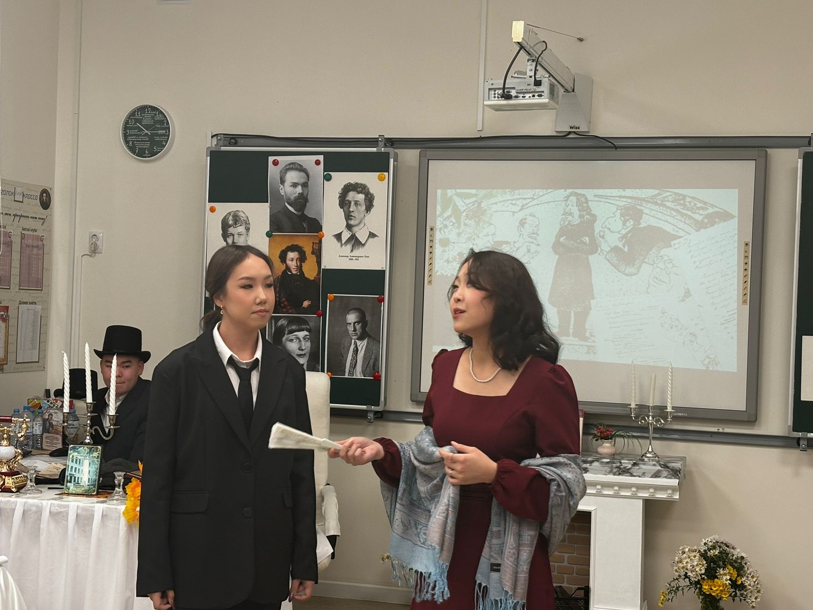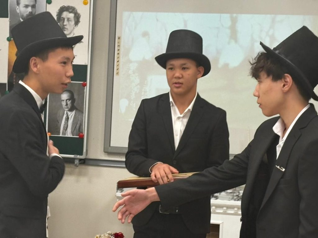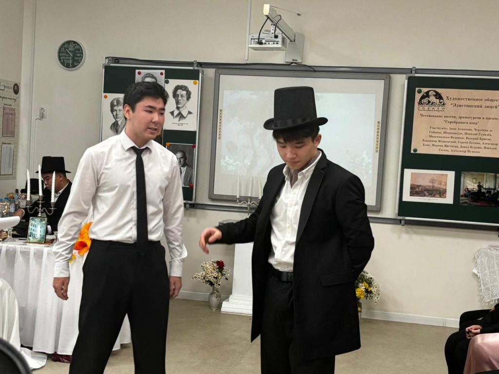 Обучающиеся 11 «а» гуманитарного профиля Элистинского лицея, кстати, в Царскосельском лицее основным направлением было гуманитарно-юридическое, провели День лицеиста в формате заседаний литературных клубов – в «Бродячей собаке», играя образы Анны Ахматовой, Александра Блока и другие; у входа в ресторан Дома литераторов – в образах героев из «Мастер и Маргарита»; в клубах, где ораторствовал Маяковский (и ребята, и родители отметили в этой роли Илью Бурлакова). И все литературные персонажи вступали в диалог и даже в полемику с Александром Сергеевичем. «Забрел» в этот день в Элистинский лицей и Николай Гоголь. Вот такой динамичный сценарий, куда вплетена и загадочная Черубина де Габриак, написали самостоятельно Дарина Дорджиева, Артем Мацаков, Савр Шарашкиев.
