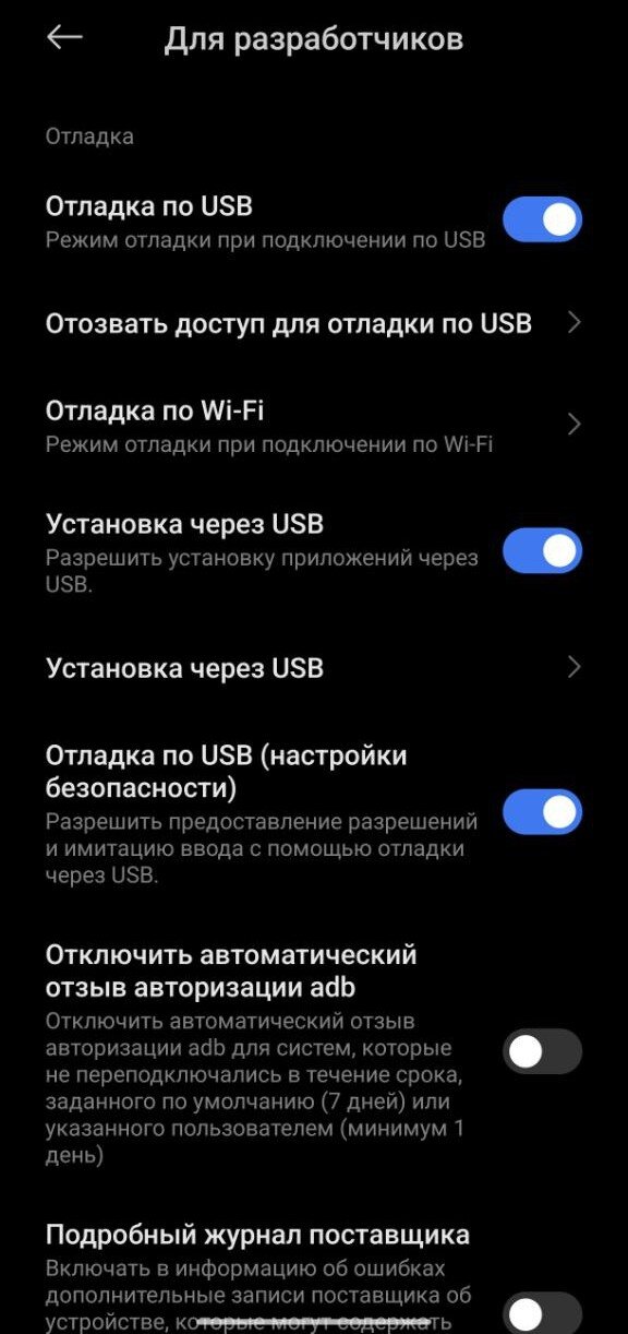 Для данного способа необходимо в начале активировать меню «для разработчиков» и в том же меню включить «Отладка по USB», «Установка через USB» и «Отладка по USB (настройки безопасности)».