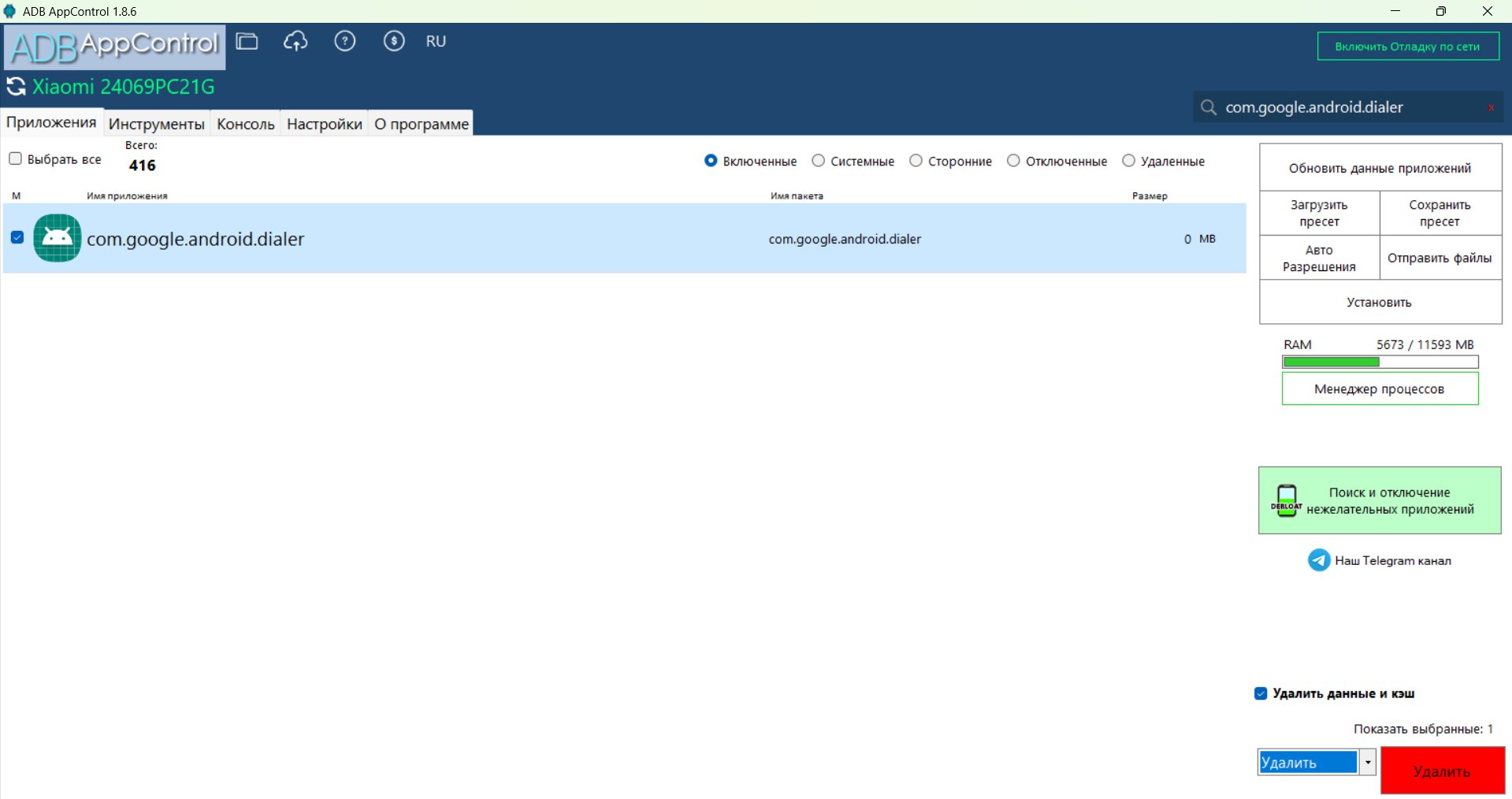 После необходимо установить ADB App Control (ссылка на официальный сайт). Открываем программу и в поиск вводим «com.google.android.dialer» и удаляем.