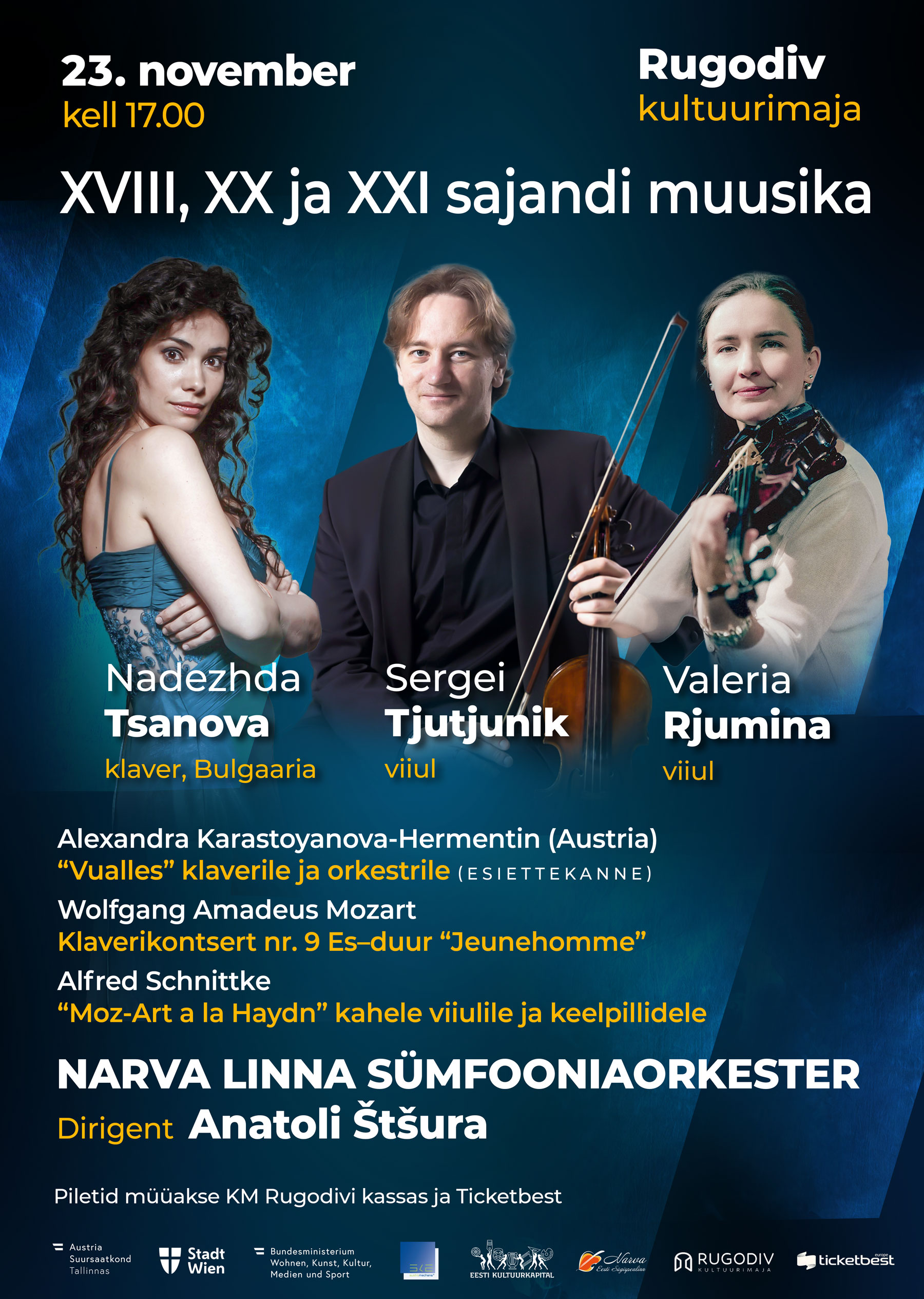 ЧТО? Осенняя столица. Музыка 18, 20 и 21 века. Новая программа Нарвского симфонического оркестра предлагает необычную музыкальную встречу классики и авангарда. Надежда Цанова (фортепиано), Валерия Рюмина (скрипка), Сергей Тьютуник (скрипка). Билеты: 6-10 евро.