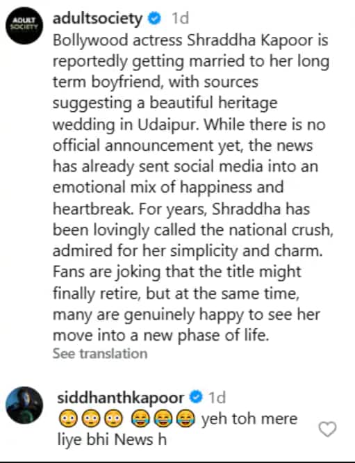 A social media page made a post, which reads, "Bollywood actress Shraddha Kapoor is reportedly getting married to her long term boyfriend, with sources suggesting a beautiful heritage wedding in Udaipur. While there is no official announcement yet, the news has already sent social media into an emotional mix of happiness and heartbreak. For years, Shraddha has been lovingly called the national crush, admired for her simplicity and charm. Fans are joking that the title might finally retire, but at the same time, many are genuinely happy to see her move into a new phase of life." Reacting to it, Siddhant Kapoor said, "(multiple surprised and laughing emojis) yeh toh mere liye bhi News hai (this is news for me too)."