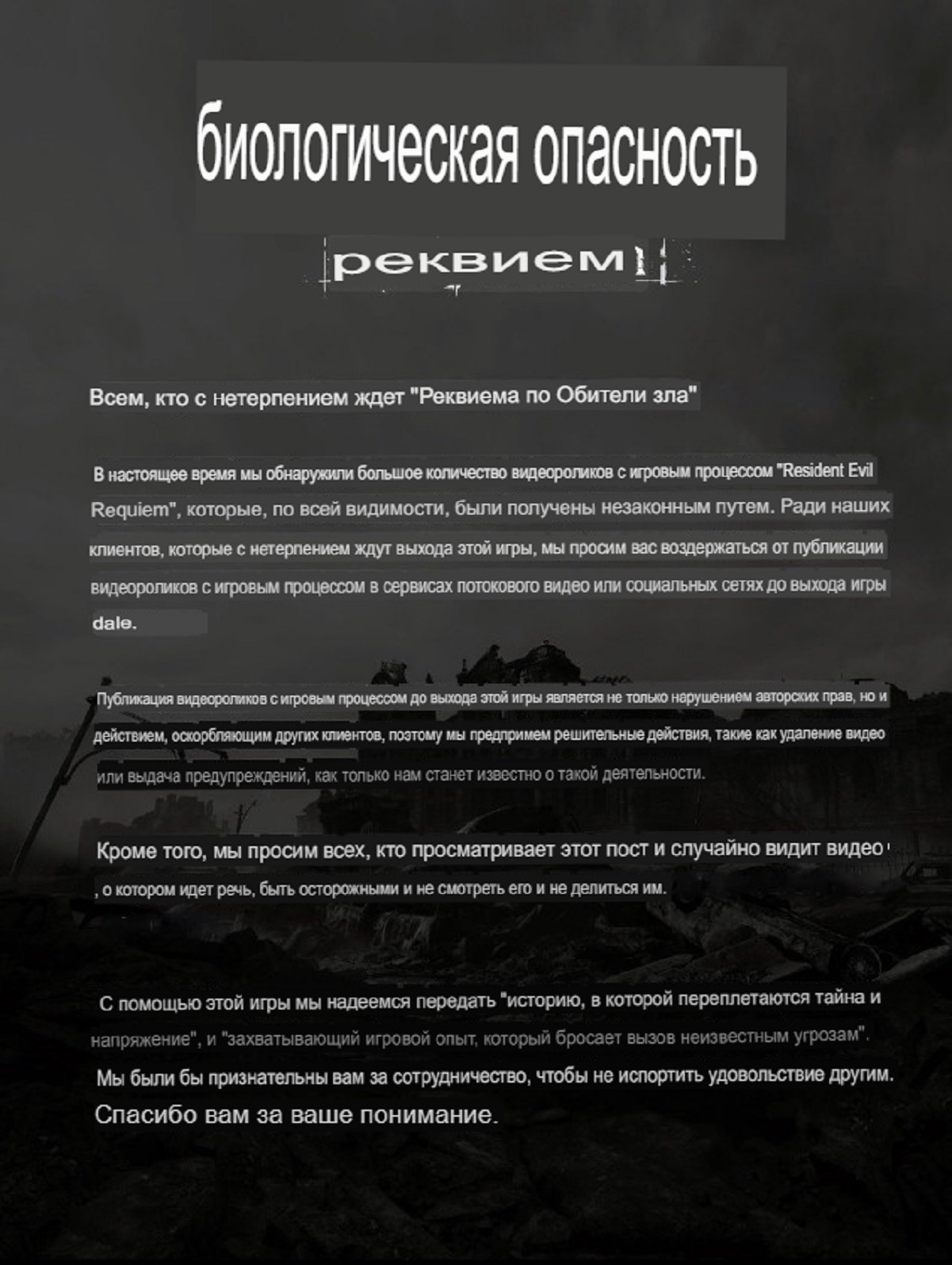 Capcom пообещала бороться с распространением информации о сюжете Resident Evil Requiem до релиза, который состоится 27 февраля на PC, PlayStation 5, Nintendo Switch 2 и Xbox Series. По мнению японской компании, публикация утечек — это и неуважение к сообществу ценителей видеоигр, и нарушение авторских прав.