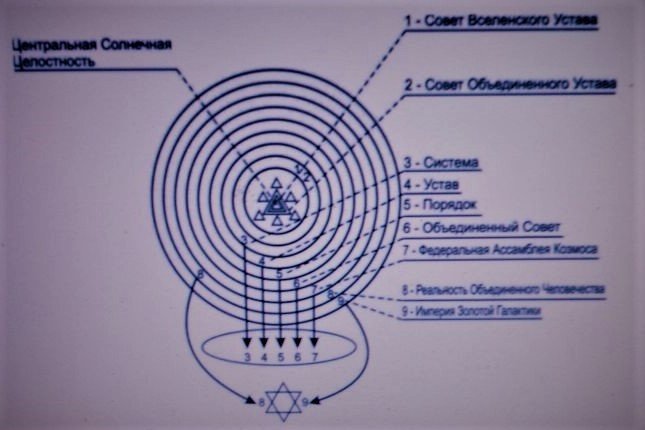 Все они принадлежат Рабочей Целостности Вселенной Света. Но Измерения, на которые они совершают Отражения, различны, и они соответствуют исполняемым ими Миссиям. Совет Вселенского Устава и Совет Объединённого Устава находятся в Первом и Втором Слоях Интенсивной Энергии Вселенной Света, и они вместе с Целостностью Центрального Солнца составляют Ядро Рабочего Порядка Измерения Все-милосердного. Система, Устав, Порядок, Объединённый Совет и Федеральная Ассамблея Козмоса находятся в 3-4-5-6-7 Слоях Интенсивной Энергии Вселенной Света и производят Отражение на Вторую Вселенную, то есть на Экзистенциальное Измерение. Целостность Реальности Объединённого Человечества и Империя Золотой Галактики находятся в Восьмом и Девятом Слоях Интенсивной Энергии Вселенной Света и производят Отражение на Объединённую Реальность, Символизируемую Шестиконечной Звездой. Империя Золотой Галактики Проецирует Знания на Мини Атомические Целые внутри Гюрза и также собирает Информацию, передаваемую оттуда. И проецирует её на Девятый Слой Интенсивной Энергии Вселенной Света, являющийся собственным Измерением Империи Золотой Галактики. Посредством этого Империя Золотой Галактики интегрирует Отражения Целостностей Галактик во Вселенных, находящихся в Мини Атомических Целых, с Отражениями реальности Объединённого Человечества. И таким образом Империя Золотой Галактики приводит в Действие рабочие Уставы Иерархических Шкал.