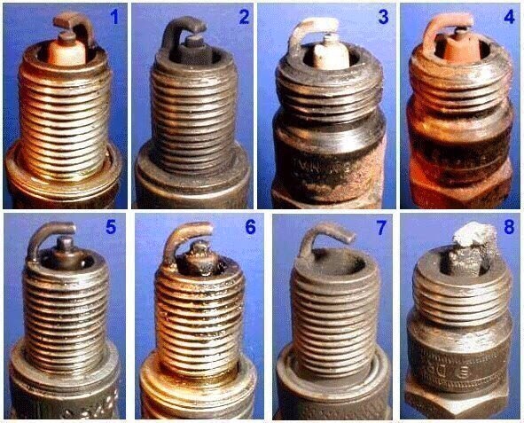 Фото № 8 - последнее в этом обзоре. Электрод свечи оброс зольными отложениями, цвет не играет решающей роли, он лишь свидетельствует о работе топливной системы. Причина этого нароста - сгорание масла вследствие выработки или залегания маслосъемных поршневых колец. У двигателя повышенный расход масла, при перегазовках из выхлопной трубы сильное синее дымление, запах выхлопа похож на мотоциклетный