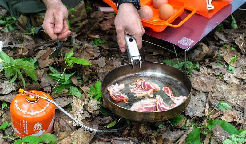 Готовить различную еду с грудинкой, что на горелке, что на открытом огне очень удобно.