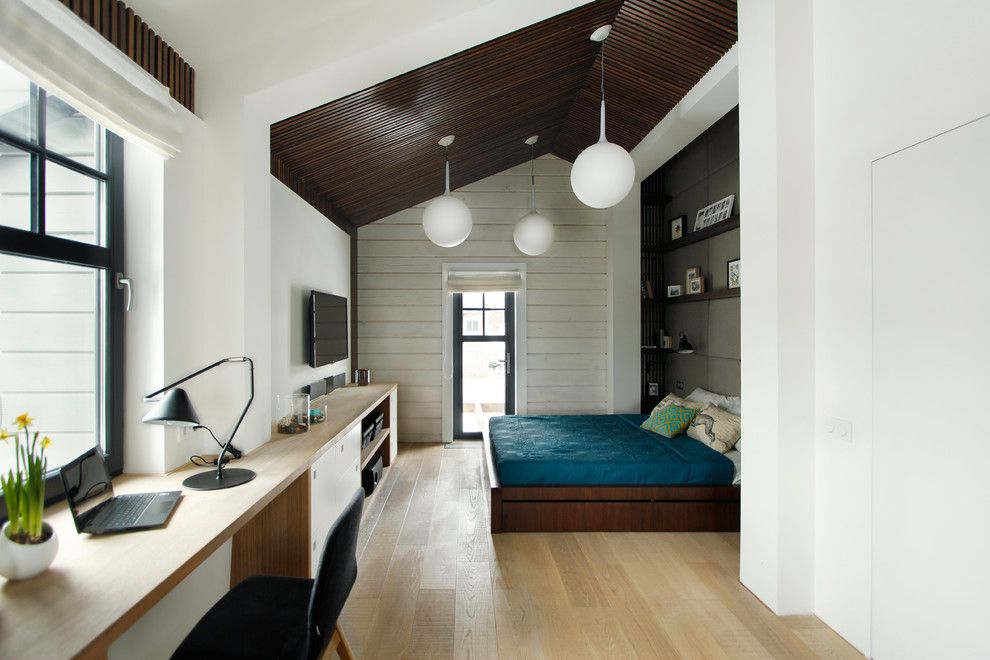 Еще один непривычный для традиционных стилей интерьера прием – использование трансформируемой мебели. Для маленьких комнат это самый подходящий вариант наполнения пространства. В современной спальне кровать может «опрокидываться» из шкафа или «выезжать» из подиума, рабочая зона – «скрываться» за стенкой углового шкафа, стойки с одеждой – «вытягиваться» за ручку из ниши в стене и т.д.