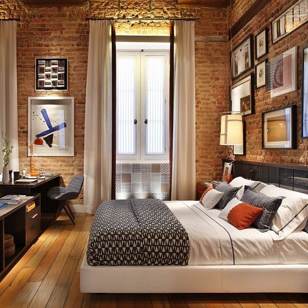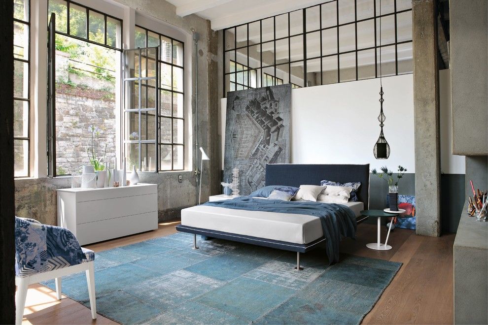 - В стиле лофт предполагается отсутствие перегородок, поэтому о спальне как об отдельной комнате говорят редко. В зону спальни обязательно ставят кровать без изысков и несколько небольших тумб или комодов. Громоздкие шкафы сюда не подходят, вещи лучше скрыть во встроенной мебели, которая сливается с цветом и фактурой стен.