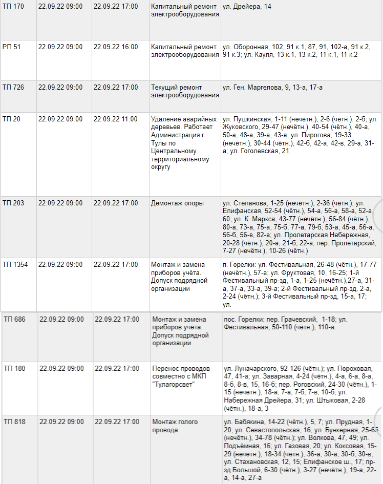 22 сентября в некоторых домах Тулы отключат свет 21.09.2022 19:15 «Первый Тульский» 22 сентября в нескольких домах Тулы отключат электроэнергию. Это связано с плановым ремонтом: удалением аварийных деревьев, установкой приборов учета и другими работами. Публикуем список адресов и время отключения.