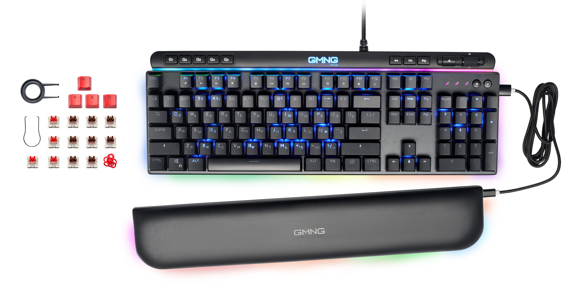 GMNG 999GK имеет RGB-подсветку с 12 режимами мерцания и однотонного свечения. Светятся не только клавиши, но и область по всему периметру корпуса, а также подставка для запястий. К слову, подставка здесь магнитная, крепится с помощью специальных захватов, да ещё и автоматически подсвечивается при приближении к корпусу. Внутри — мягкий наполнитель, которые позволяет комфортно работать и играть в течение дня. В комплекте с клавиатурой идут сменные свитчи (8 коричневых и 4 красных), которые можно заменить в любой момент при помощи Hot-Swap.
