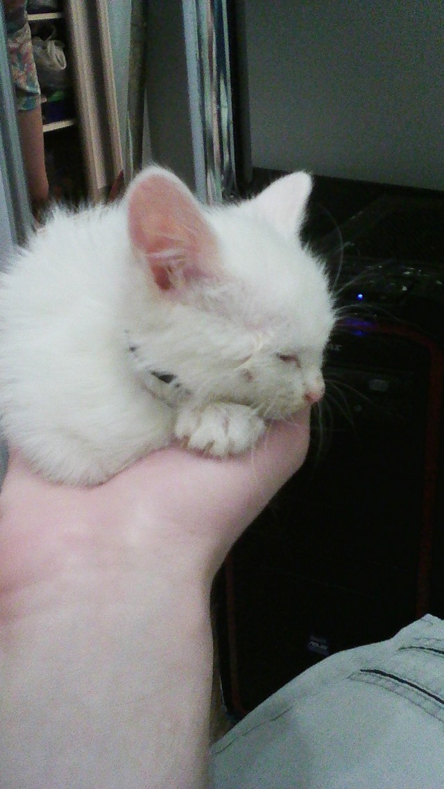 Матери у него видимо не было, слишком он неухоженный был. На следующий день сводил к ветеринару, сказали ему нет и 2-х месяцев, маленький вес, но это не существенно, выписали препараты которые давать, в общем теперь этот котя со мной, любит спать в ладонях.