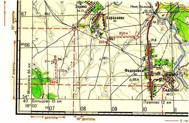 Чтобы указать приближенно местоположение какого‑либо объекта на карте, достаточно указать квадрат сетки, в котором он расположен. Квадрат всегда указывается цифрами километровых линий, пересечением которых образован юго‑западный (нижний левый) угол. При указании квадрата карты придерживаются правила: сначала называют две цифры, подписанные у горизонтальной линии (у западной стороны), то есть координату «X», а затем две цифры у вертикальной линии (южная сторона листа), то есть координата «У». При этом «X» и «У» не говорятся. Например, засечены танки противника. При передаче донесения по радиотелефону номер квадрата произносят: