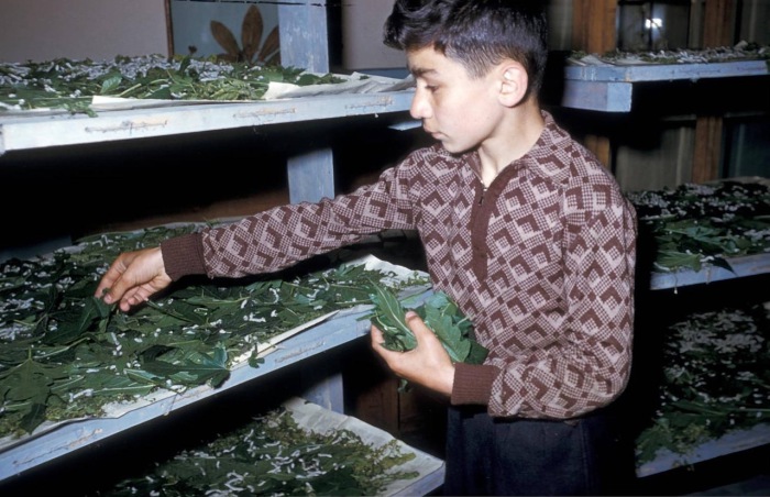 Мальчик перебирающий и готовящий тутовые листья к высушиванию. Тбилиси, 1964 год.