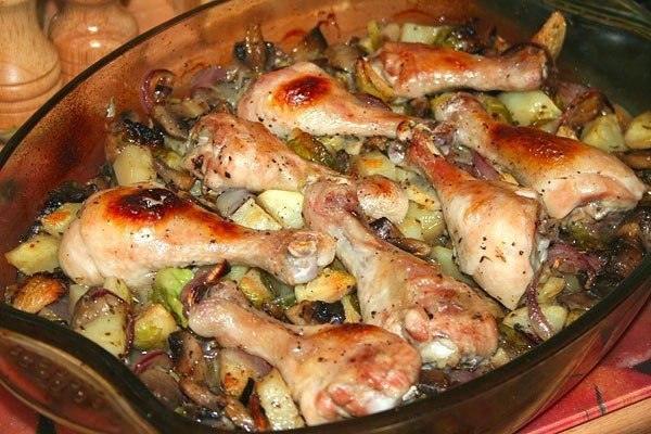 Овощную смесь выложить в форму. Сверху водрузить куриные голени, накрыть форму фольгой и запекать в духовке при 200 градусах минут 30-40, затем снять фольгу и зарумянить под грилем.