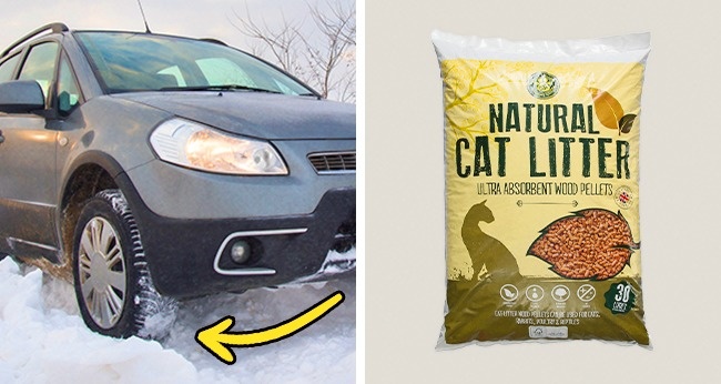 Также стоит хранить в багажнике пару упаковок наполнителя для кошачьих туалетов, лучше всего древесного. Если машина забуксовала в сугробе или на льду, то нужно высыпать немного наполнителя под колеса, тогда вы без труда сможете выбраться.