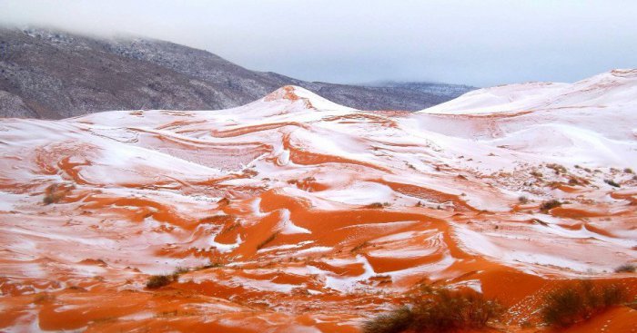 Пустыня и снег — понятия, трудно укладываемые в голове рядом друг с другом, однако в природе бывает всякое. В алжирском городе Аин Сефра, именуемом воротами в Сахару, на днях выпал снег.