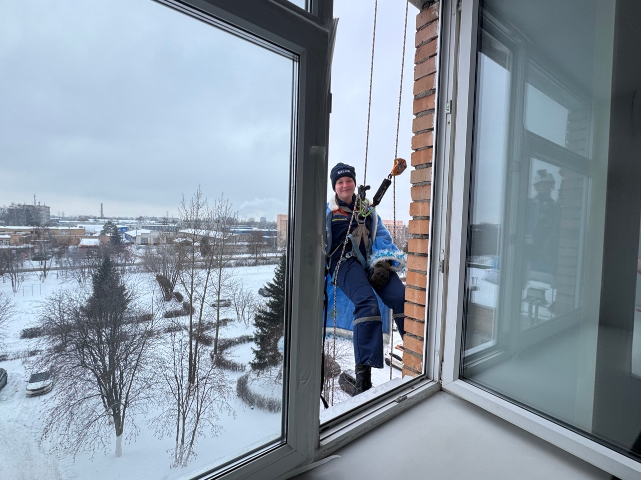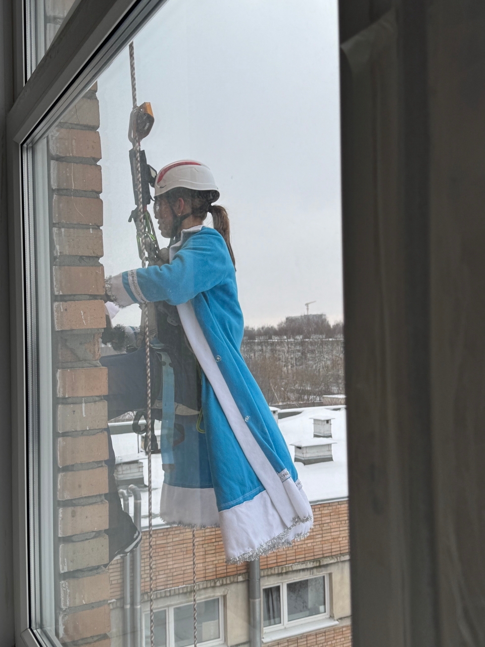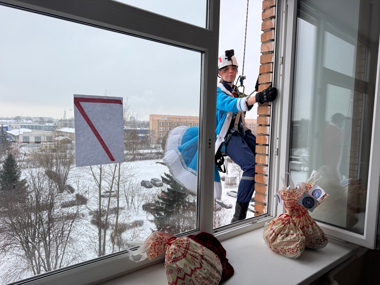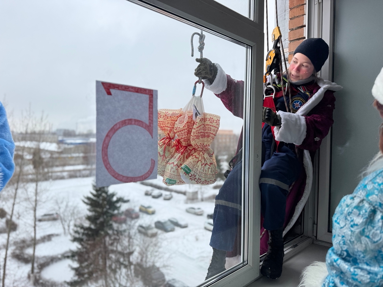Однако главный сюрприз ждал детей впереди. После викторины с крыши медицинского учреждения, используя альпинистское снаряжение, спустились волонтеры аварийно-спасательного центра «Салюс» в костюмах Дедов Морозов и Снегурочек. Они передали детям в окно мешки с большими сладкими подарками.