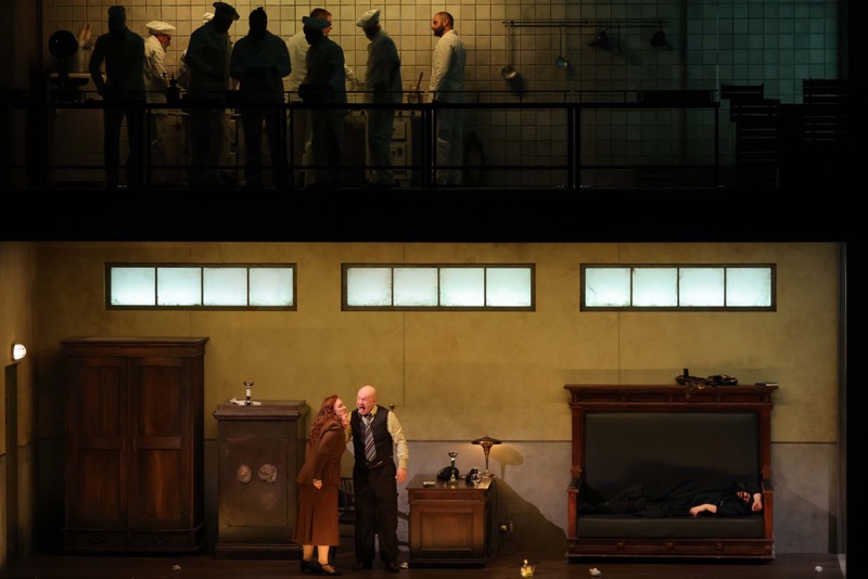 Из первой левой кулисы периодически выезжает двухуровневая конструкция из горизонтальных павильонов, соединённых лестничным пролётом и изображающих кухню, в которой трудятся повара (там же они будут издеваться над официантской Аксиньей, поливая её майонезом и посыпая мукой), и кабинет руководителя с характерными для той эпохи монументальным кожаным диваном, шкафом и сейфом, в котором любовник Катерины повар Сергей спрячет потом труп мужа Катерины Зиновия Борисовича.
