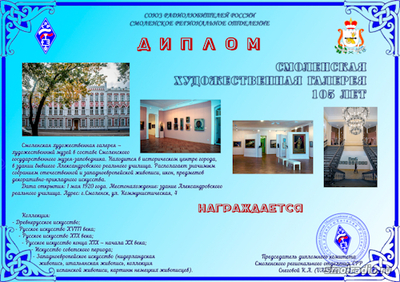 Продолжая тему музеев области разработан и опубликован диплом "Смоленская художественная галерея. 105 лет". Диплом размещен на сайте HamClub.ru. Прямую ссылку на диплом можно найти на форуме Смолрадио в теме: Главный раздел» Новые дипломы» Дипломная площадка HAMCLUB.RU (Дипломная программа Смоленского РО СРР).